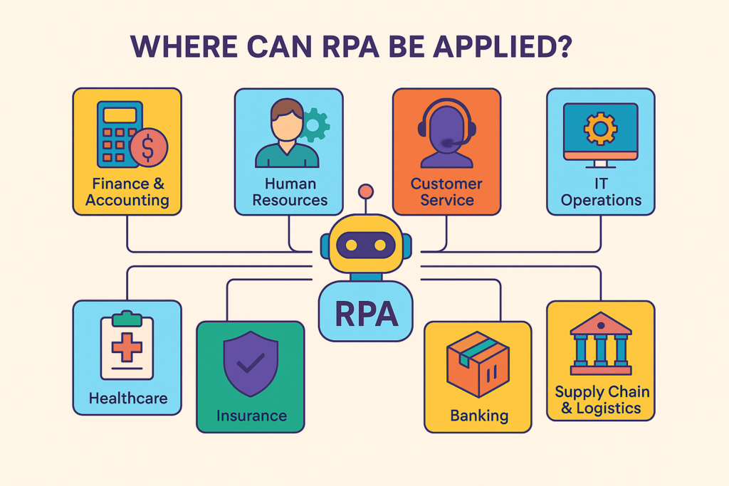 Robotic Process Automation (RPA) has become a game-changer for organizations across different sectors. Its adaptability makes it useful in virtually any environment where routine, digital tasks are part of everyday operations. If a process is rules-driven, repetitive, and involves handling data across systems, RPA can step in and take over—boosting efficiency while reducing manual errors. Robotic Process Automation (RPA) can be applied across a wide range of industries and departments, streamlining tasks that are repetitive, rule-based, and time-consuming.